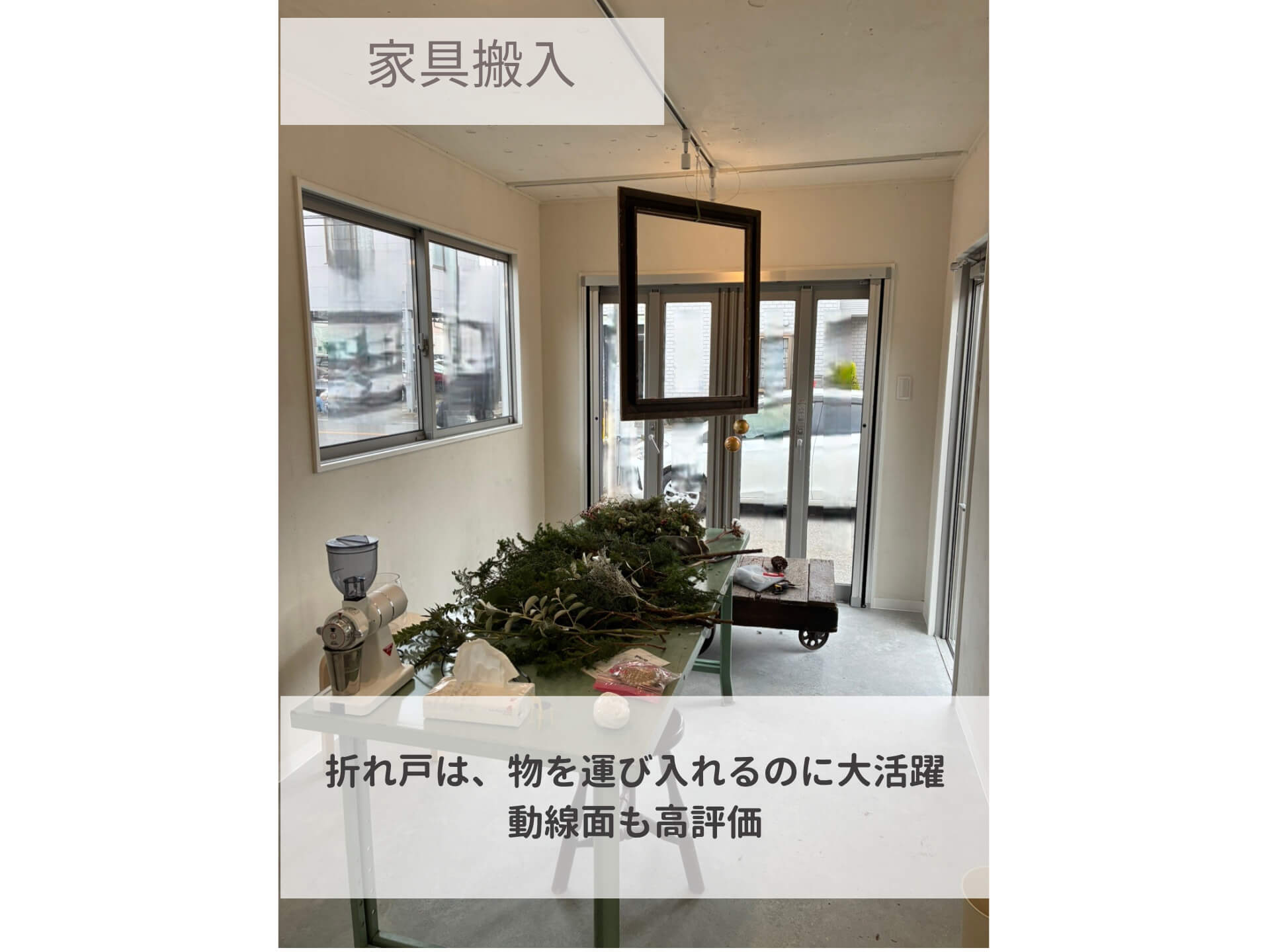 「折れ戸は、物を運び入れるのに大活躍でした。大きな家具や花材も難なく運べました。」と動線面も高評価いただきました。